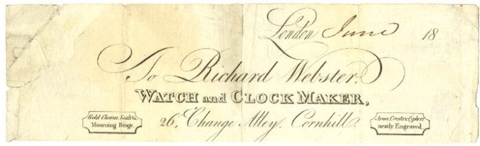 By tracing the Webster family through the generations, and almost 200 years of continuous business, we can reveal the trends and trials of British clock-making during its most illustrious centuries. The Webster’s business was first established in Exchange Alley in 1711, just off Cornhill and the nearby Royal Exchange. In the subsequent years the shop relocated a number of times, but never moved far. For well over 100 years, up until the late 1800s, the Websters traded within striking distance of Cornhill. Cornhill was a bustling area packed with coffee houses and shops, from barbers to bootmakers, booksellers to bankers. A number of chronometer, watch and clock makers had their businesses in the area – the Webster’s were in good company.