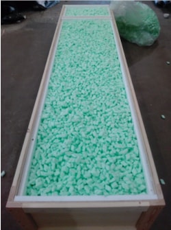 Each crate is uniquely designed and made for each purchase. Shown is a design of long case clock with one fixed partition wall creating two individual compartments. In this example each compartment has been fully lined with polystyrene sheeting. A base layer of poly loose fill is added before placing the wrapped main body and parts into the large compartment. The wrapped clock movement is then placed within the smaller compartment. More loose fill is added to fill all spaces followed by a top layer of polystyrene sheeting. The crate is now sealed ready to be shipped to the customer. All parts of a clock have been together for many years. We design each crate so that all parts can be safely packed and remain together whilst being shipped. The body of the crate is hardwood ply framed with ISPM15 (heat treated timber). Each layer of wrapping, lining and protection, protects against climatic moisture changes and sudden impact shock whilst in transit. Packing everything safely and securely into a single low profile crate allows quality packing and shipping costs to be kept to a minimum.