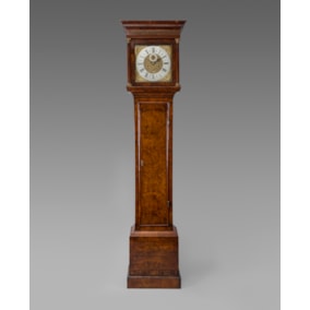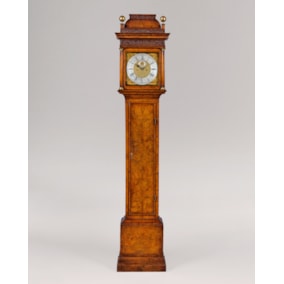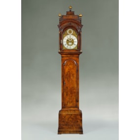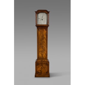 The elegant hood is surmounted by a fret with three brass ball and spire finials. The hood door is framed by the chamfered and reeded hood corners which terminate in brass at the bases. The well proportioned case has the finest crutch wood figured mahogany veneers to both the full length trunk door and the panelled base. The clock stands on its original shaped double plinth.
